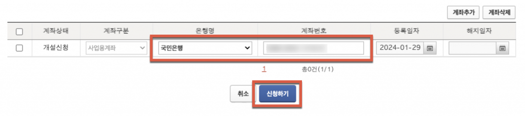 은행과 계좌를 선택한 후 신청하기 버튼을 클릭합니다.
